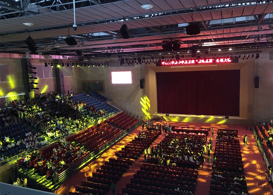 中山大學(xué)新華學(xué)院東莞校區(qū)體育館舞臺(tái)燈光系統(tǒng)由銳聲旗下代理品牌產(chǎn)品V-light和筑夢(mèng)DLW系列燈具打造。