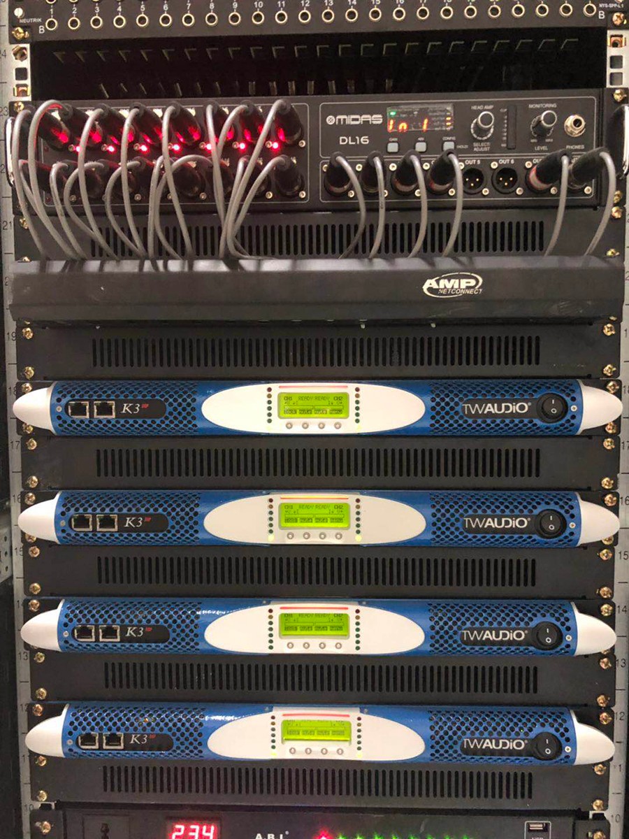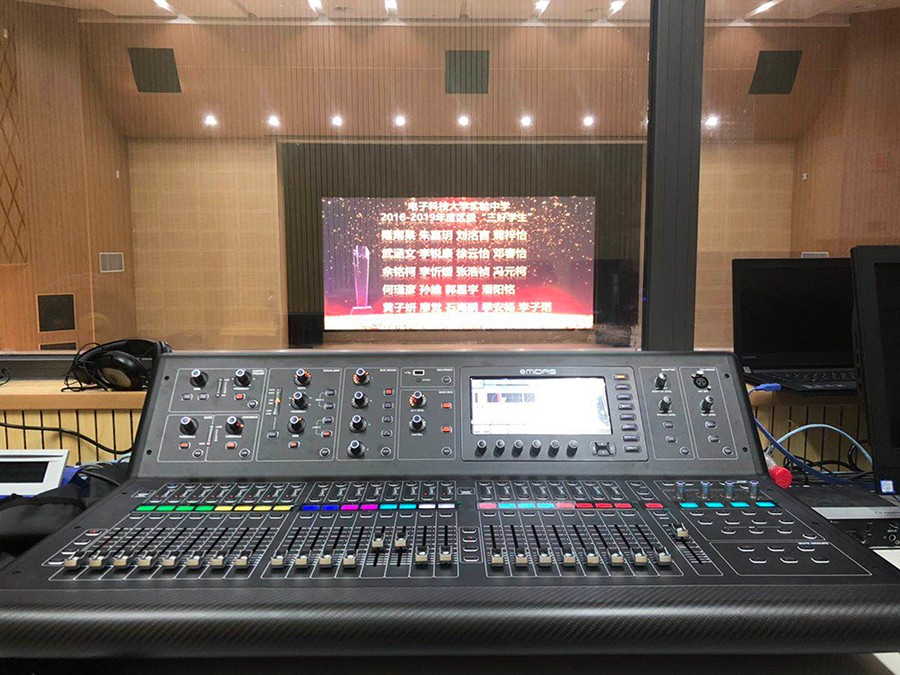 電子科技大學(xué)實(shí)驗(yàn)中學(xué)劇場(chǎng)主擴(kuò)聲系統(tǒng)采用6只90°的T20點(diǎn)聲源線陣列揚(yáng)聲器打造,2只為一組分別吊掛在舞臺(tái)兩側(cè)和舞臺(tái)中央作為主擴(kuò)聲,2只M12全頻音箱搭配2只B30超低放置在舞臺(tái)兩側(cè)作為前補(bǔ)聲以及低音補(bǔ)充,除此之外還有C12作為舞臺(tái)監(jiān)聽。整套系統(tǒng)由4臺(tái)K3DSP數(shù)字功放驅(qū)動(dòng)。監(jiān)控室內(nèi)采用英國(guó)Midas M32數(shù)字調(diào)音臺(tái)以及DL16舞臺(tái)接口箱。